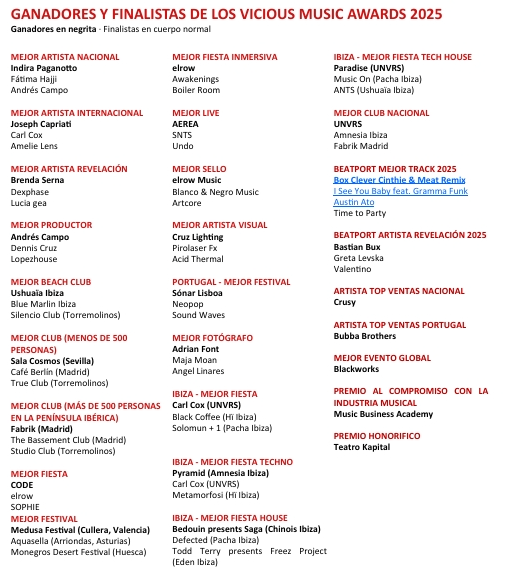 A edição de 2025 dos Vicious Music Awards, organizados pela revista espanhola Vicious Magazine desde 2011, voltou a reunir no Teatro Kapital, em Madrid, alguns dos nomes mais influentes da eletrónica ibérica e internacional. A gala celebrou um ano particularmente forte para o género em Espanha, mas também no nosso país.